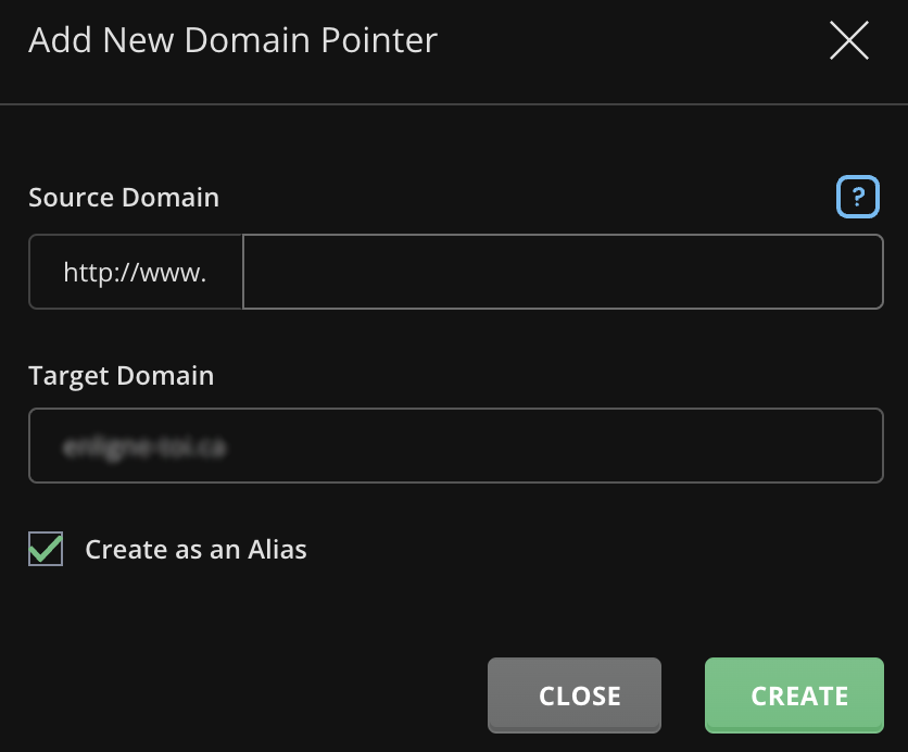 - Enter the Alias (mapped) domain into the Source field and ensure Create as an Alias is checked.