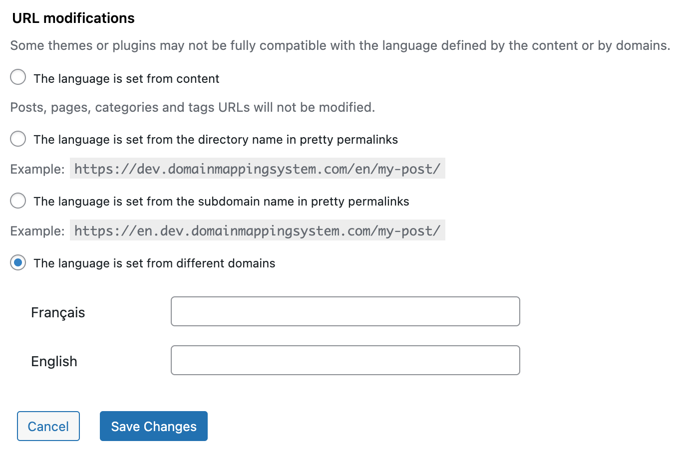Though we don't have a full integration with PolyLang plugin at this point, you can map domains to specific languages defined in PolyLang.