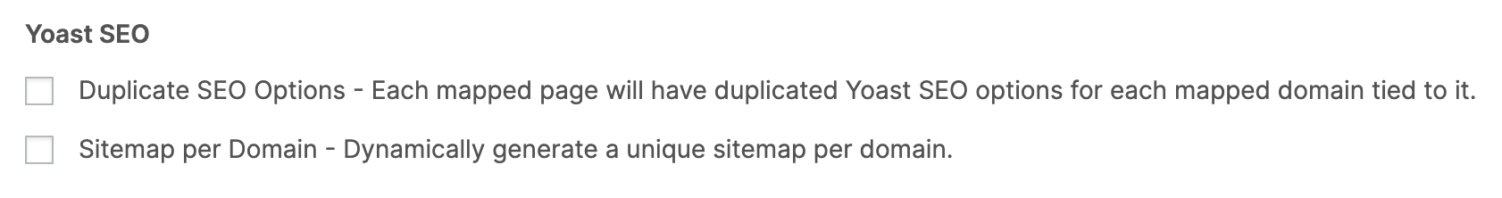 Domain Mapping System now has a direct integration with Yoast SEO. You can set custom Titles, Descriptions, and Keywords for all mapped versions of a page, as well as enable a sitemap per domain.
