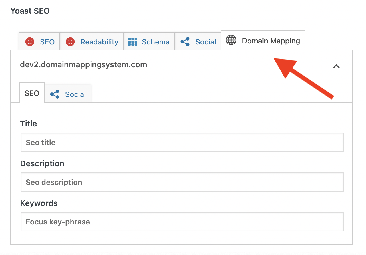 Please note that the Yoast SEO integration in Domain Mapping System a PRO feature that can be enabled with the free version of Yoast SEO. Please check our website pricing for details.