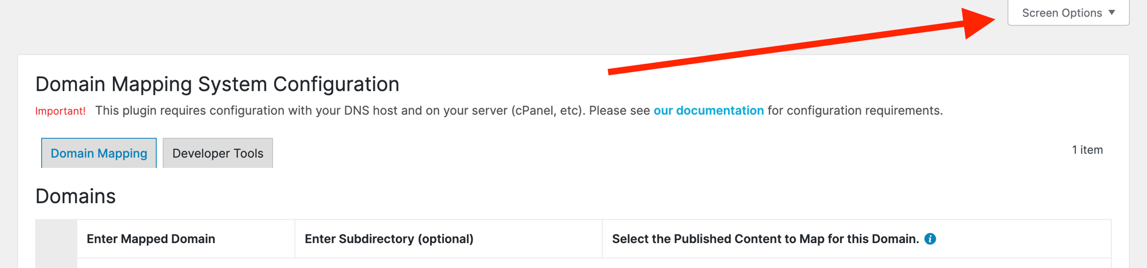Pagination can be found hidden in the Screen Options at the top of the WordPress Dashboard when viewing the Domain Mapping System plugin settings area: